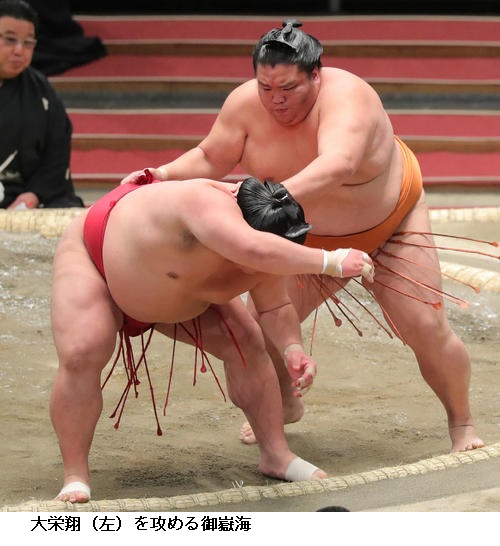 ▽大栄翔に御嶽海は御嶽海が送り出し。