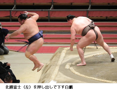 ▽横綱 白鵬に北勝富士は白鵬が押し出しで勝って1敗を守りました。