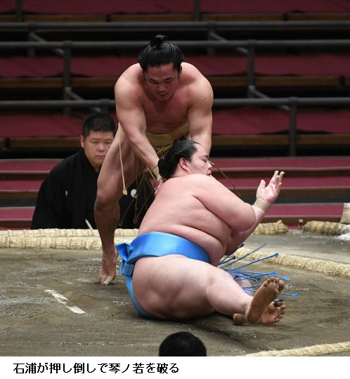 ▽新入幕の琴ノ若に石浦は石浦が押し倒しで勝ち越し。