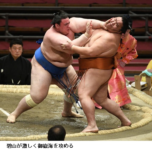 御嶽海を破って1敗を守った碧山は「よかった。当たって前に出られている。御嶽海関とはよく稽古しているから稽古場みたいにやろうと思っていた。きょうは落ち着いていて足もよく出ていた」と振り返りました。単独トップに立ったことについては「いやいや、またあす稽古をやって。1日、1日、あと3日ありますから」と話していました。