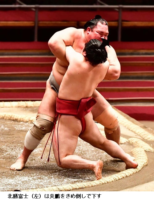 ▽炎鵬に北勝富士は北勝富士がきめ倒し。炎鵬は負け越しました。