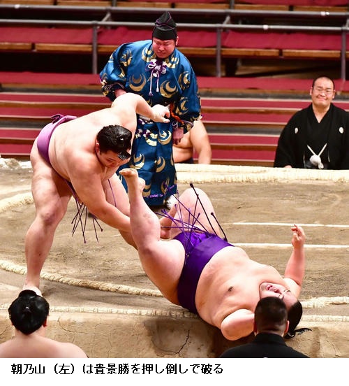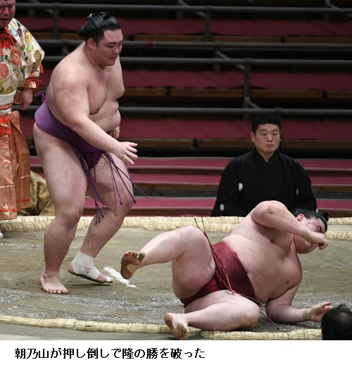 ▽隆の勝に大関昇進がかかる関脇・朝乃山は朝乃山が押し倒しで勝って10勝目を挙げました。