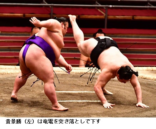 ▽竜電に大関・貴景勝は、貴景勝が突き落としで勝ちました。竜電は負け越しです。