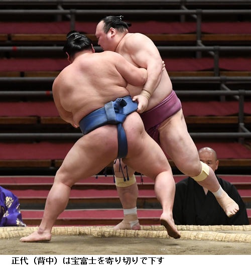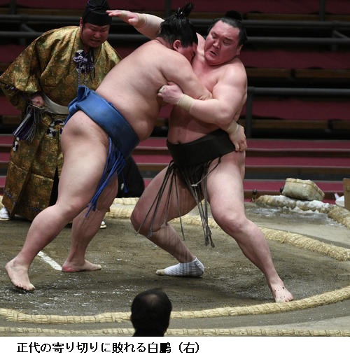 ▽正代に横綱・白鵬は、正代が寄り切りで勝ちました。白鵬は2敗目を喫しました。