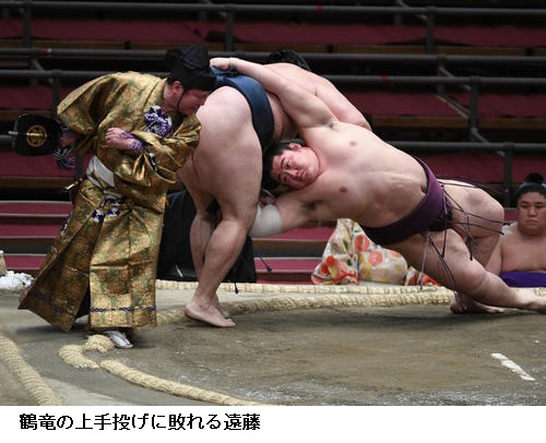 ▽横綱・鶴竜に遠藤は、鶴竜が上手投げで勝ちました。