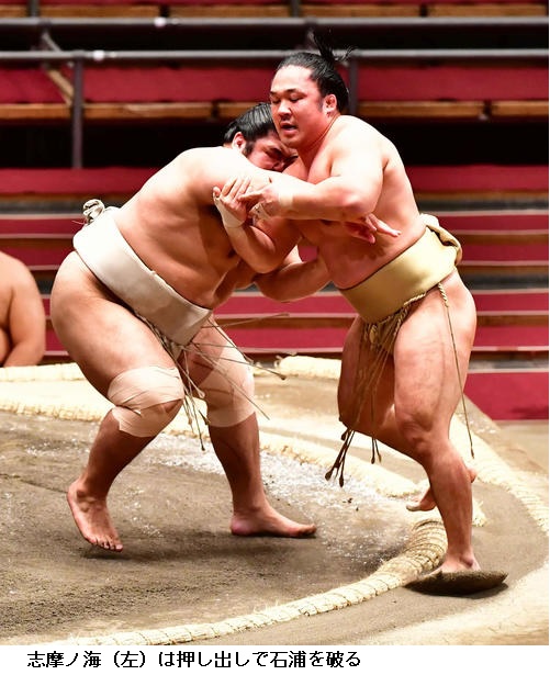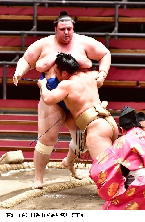勝ち越しを決めた石浦は「最近は相手を見る相撲が多かったので攻めていこうと思った。勝ち越しを意識せずに攻めることができた。ふた桁勝利を目指して頑張りたい」とほっとした様子でした。