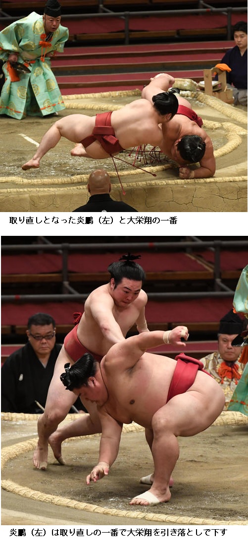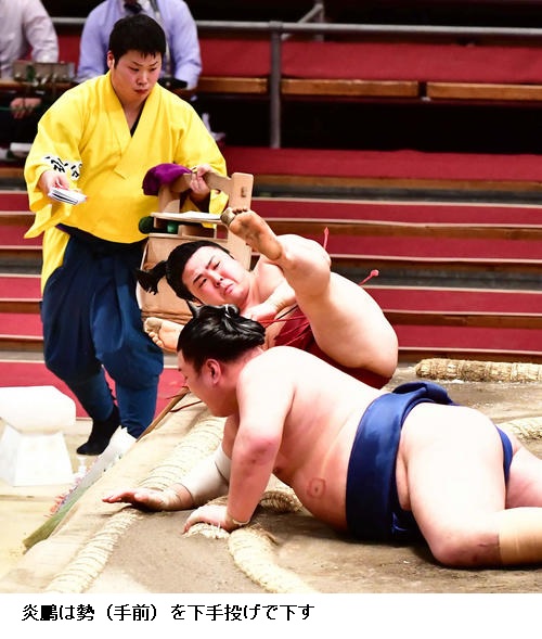 炎鵬は負け越し「相手を動かして慌てさせたかったが見られてしまった。負け越しは今の自分の実力、しっかり受け止めて残り3日間はしっかりと自分の相撲を取りたい」と悔しそうな様子でした。