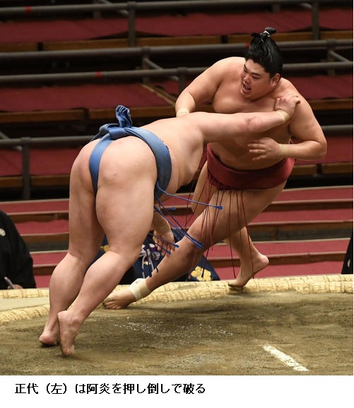 ▽阿炎に正代は、正代が押し倒し。阿炎は負け越しです。