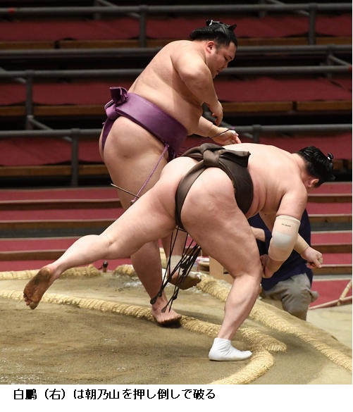▽横綱 白鵬に関脇 朝乃山は、白鵬が押し出しで勝って2敗を守りました。朝乃山は3敗に後退です。