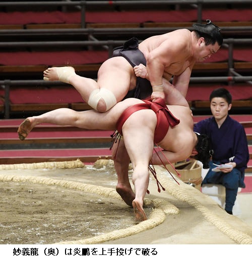 ▽隠岐の海に妙義龍は隠岐の海が寄り切り。妙義龍は負け越しました。