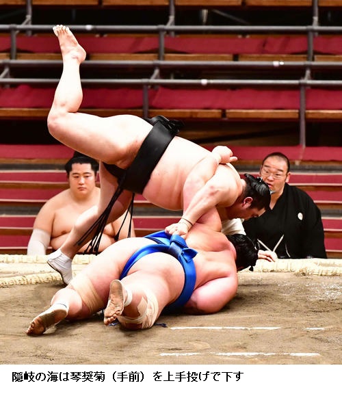 ▽隠岐の海に豊山は、隠岐の海が突き落とし。