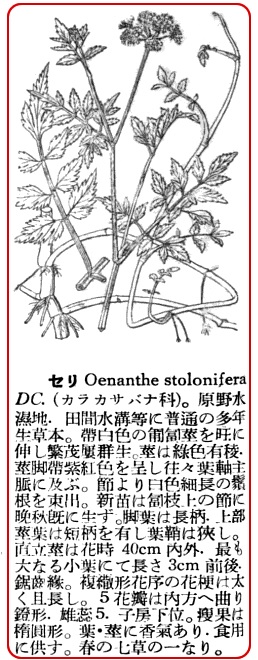セリは水斳(みずせり)で通常芹の字を使っているが実を言うと芹一字だけでは不徹底である。セリは原頭、山足などの水に生えその白いヒゲ根を泥中に下している。採って見ると白い根が多いので故に古歌にはネジログサと称えた。溝などの中を覘(のぞ)くと早春から既にそのセリが一杯に繁茂している。古人はこれを望み見てセリとは迫(せ)りこ迫りこして生えているからそれでそういうのだといっているが、果してそれが語原であるか否かなお再考を要する様に思う。この様に実際セリは常に密集して生えているが、考えて見るとセリにはそう生える原因が存している。セリの茎が立って梢に花の咲く時分前後モウ既にその茎の下部から四方八方に匐枝を引き長く泥面を這うている。その匐枝には多くの節がある。その各節から秋以後皆株をなして葉を萌出するのでそれで溝一杯に繁茂するのである。ツマリ株が多数に出来たのである。春にこのセリを摘む時分には最早その前年の匐枝は多くは既に腐り去っているから、そこでセリが一株一株の苗となって生えている事になる。