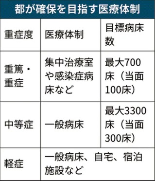 患者が増える可能性に対しては「重篤・重症」「中等症」「軽症」と症状に応じた医療体制を整備する。都立・公社病院に民間病院も加えた医療機関で4000床規模の病床の確保を目指す。軽症者は一般病床のほか、自宅や宿泊施設で療養してもらうことも視野に入れる。