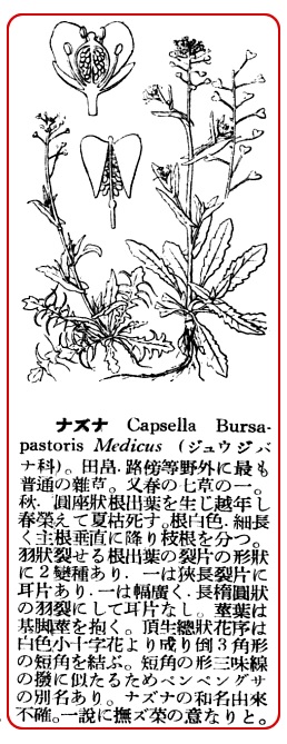 ナズナは春の七種の中で最も著名かつ代表的の者で、秋に早く種子から生じ野外や路傍や圃地などに沢山見られる。冬の間敢て霜にも雪にもメゲズ平たく地面にへばりついてその深く羽裂せる根生葉を四方に拡げ、日当りのよい処に生えている者は暗褐色を呈しているが日蔭げの場処に在る者は緑色である。そして葉の下には白い直根があって地に入っている。葉の切れ方には二たイロあってそれぞれ株が違っている。すなわち一はその裂片が単に長橢円形であるが一は狭長でその上縁の本に方に著しい一耳片が着いている。