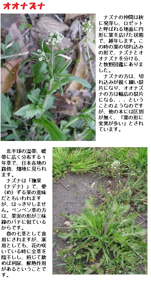 右は何方(どちら)もナズナであって、前者をオオナズナといい後者を単にナズナと称えて区別する。けれども決して別種ではなく共に花穂も花も果実も同じである。茎は緑色で枝を分ち花は小さくて多数総状花穂に着き白色の十字花で花中に四長二短の大雄蕊を有する。花がすむと三角形の短角果実を結ぶ事は衆のよく知る所である。