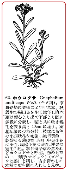 支那の名は鼠麹草でキク科に属する。オギョウは御行と書くが、これをゴギョウというのはよくない。それ故五形と書くのは非である。時には御鏡と書いてあるものもある。この草の本名はホウコグサ(発音ホーコグサ)というのダが普通にはハハコグサ(母子草)と称えて今日はこれが通称の様に成っている。しかしこれをハハコグサといい母子草と書くのは甚(はなは)だ宜(よろ)しくない。人によると母子草とは旧(ふるき)苗に若葉の添うて生ずれば母子という名も義(ことわり)であるなどと唱うるは全く牽強附会の説である。元来この草の名は母と子という意味から附けられたものではない。すなわちこの間違の起りは文徳(もんとく)天皇御一代の歴史を書き集めた『文徳実録』の著者が一つの因縁話を仕組みホウコとハハコと音相近きを以て本来のホウコグサをモジッテ母子草としたのが始まりである。ゆえによく諸書に母子草の名は『文徳実録』からダと書いてある。もしもこの名が昔からの本来のものであれば何も特に『文徳実録』を引き合いに出す必要は少しも無いじゃないか。