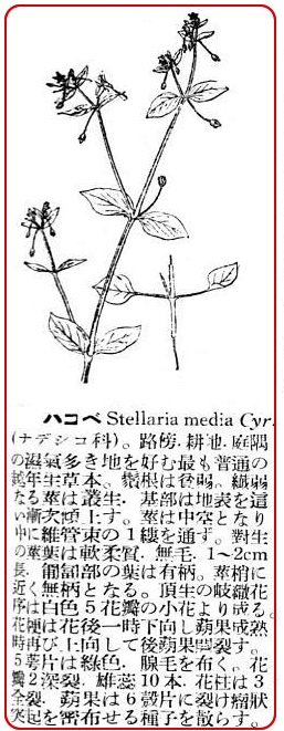 世間ではこの草を金糸雀(かなりや)の餌にする事は誰れでも知っているだろう。またこの草を焼いて灰と成し、塩を交えてハコベジオと称する歯磨き粉を製する。