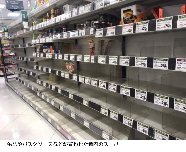 東京都の行動自粛要請の後、都内各地のスーパーなどでは、食料品をまとめ買いする人の列が見られた。