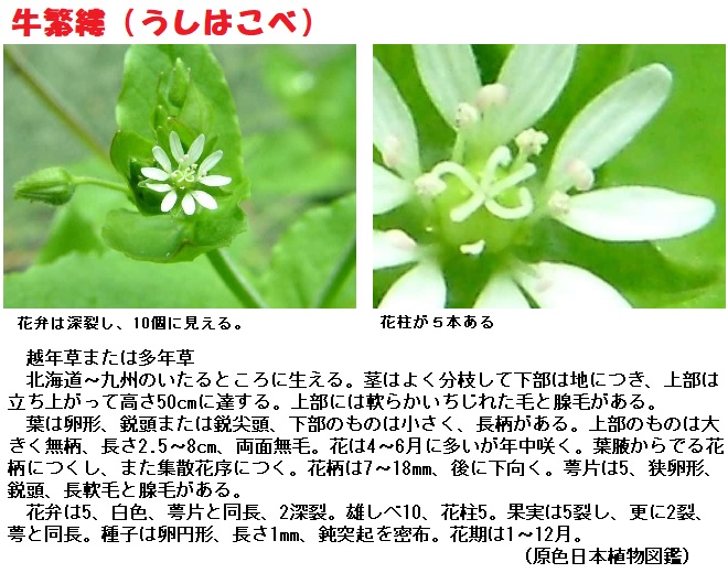 一種ウシハコベという者がある。形ちもズット大きくハコベより後(おく)れて花が咲く。花の大さも形ちも同じだが花中に五本の花柱があるので三本花柱のハコベとはこの点を観れば直すぐに区別がつく。このウシハコベは金糸雀には遣らない。