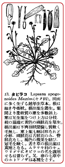 この今名タビラコ古名ホトケノザは、我邦諸州の田面に普通で秋に種子から生じ早春に漸く繁茂し、春闌(たけ)なわにして日光を受け競うて小なる黄色の頭状花(舌状花より成る)を開きすこぶる美観を呈する。草状はタンポポを極く小形にした様にその羽裂葉を四方に拡げ柔かくして毛なく、サモ食ってよい様な質を表わしている。ゆえに農家の子女などは往々タビラコあるいはタビラッカを採りに行くと称して田面に下り立ちそれを採り来りて食用に供する事がある。その田面に小苗を平布し円座を成した状が宛(あた)かも土器かわらけを置いた様に見ゆるから、それでこれをカワラケナといったものであろうと思う(マサカ毛が無いからではあるまい、ハハハハハ)。またその苗が田面に平たく蓮華状の円座を成している状を形容してこれをホトケノザ(仏ノ座)と昔はいったものと見える。また苗の状から田平子(たびらこ)、すなわち田面に平たく小苗を成しているのでそこでタビラコという名が出来たといえる。もしタビラコという名が田平子なる字面通りの意であったならこのキク科のタビラコこそ最も適当な者であるが、しかし今日いう所のムラサキ科のタビラコは頗る不適当の者である。何んとなればこの草は普通に田面には生ぜず常に田の畦とか路傍とか、または藪際とかの寧(むし)ろ乾いた地に生えているからである。そしてまたその葉は余り平たく地に就てはいない。しかるに世人はこのムラサキ科のいわゆるタビラコ(すなわち学名を Trigonotis peduncularis Benth. と称する)を本物と間違え、妄(みだ)りにこれを春の七種の一つだと称なえスマシ込んでいる。さてそういう様に始めて俑(よう)を作った人は『本草綱目啓蒙』の著者の小野蘭山である。