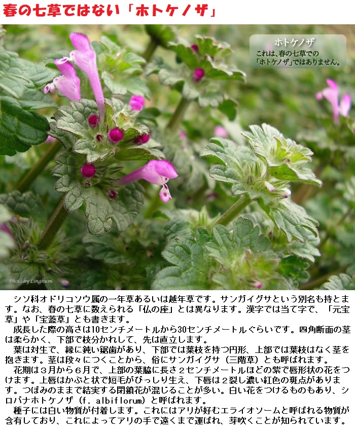 小野蘭山時代頃よりしてそれ以後の本草学者は春の七種の中にホトケノザを皆間違えている。これらの人々のいうホトケノザ、更にそれを受継いで今も唱えつつある今日の植物学者流、教育者流のいうホトケノザは決して春の七種中のホトケノザでは無い。右のいわゆるホトケノザは唇形科に属して Lamium amplexicaule L. の学名を有しそこここに生えている普通の一雑草である。