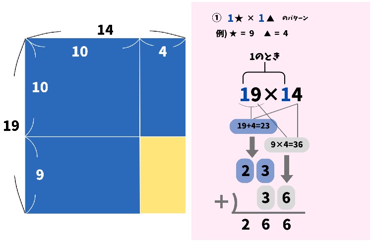 ちなみに、ひっくり返して14×10+10×9としても、(14+9)×10+36=230でやはり答えは230になります。