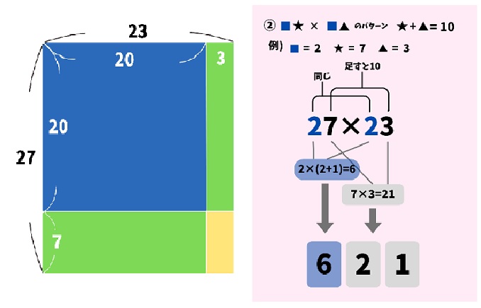 {(一方の数)+(他方の数の一の位)}×(十の位の数×10)+(一の位の数の積)